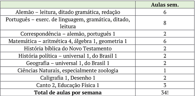 Não havendo prescrições para as escolas particulares de matérias de estudo a serem lecionadas, o currículo escolar sintetizava o propósito educativo da comunidade teuto-brasileira local. Ao longo das primeiras décadas, as aulas eram ministradas em língua alemã, tendo em vista a presença de membros religiosos da comunidade, ligados às atividades educacionais, oriundos de regiões da Alemanha, como Rudolf Feix, proveniente da Baviera, responsável pelas classes de canto. Igualmente, o professor de português era integrado ao grupo de docentes, como demonstra a contratação de Ernesto Barros. Nesse sentido, a partir de um documento apresentado na assembleia geral da comunidade no ano de 1914, destacava-se a seguinte grade curricular conforme o Quadro 1:
