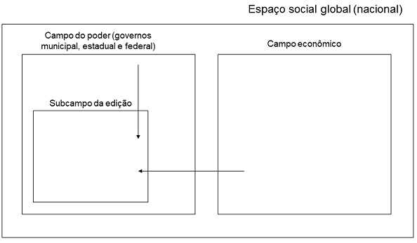 Conforme a Figura 1, os interesses sociais dos agentes que atuam nesse subcampo são submetidos aos interesses do Estado (enquanto campo de poder) e do mercado (ligado ao campo econômico). Ainda que os agentes possuam uma autonomia relativa no que respeita às suas decisões do que valeria a pena ou não publicar, eles sofrem influências diretas de lutas e concorrências existentes nos campos superiores. Os poderes político e econômico detêm, respectivamente, o monopólio do capital cultural e o do capital econômico.