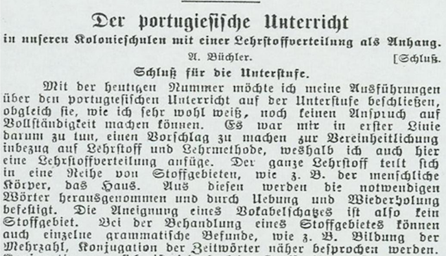 É pertinente destacar que, a partir de fevereiro de 1908, inicia-se uma seção sobre o ensino de português. Neste ano, são publicadas mensalmente até o mês de outubro orientações aos professores sobre o ensino da língua, vista como estrangeira, uma vez que o alemão era a língua materna das crianças da colônia. A autoria das matérias ficou a cargo de Georg August Büchler, professor da Neue Deutsche Schule (hoje Escola de Educação Básica Pedro II) em Blumenau e autor de inúmeros livros, entre eles Portugiesisches Sprachbuch für Kolonieschulen (Curso de Português para Escolas de Colônia) destinado ao ensino de português para imigrantes alemães, publicado em 1914 e reeditado em 1924, pela tipografia de G. A. Koehler. Além da gramática, Büchler publicou ainda Aritmética Elementar, em três livros; O melhor método de desenvolver o ensino primário no Brasil (1923); Guia de conjugação (1924), Conjugação em português (1935) também pela tipografia Koehler, entre outros. Büchler foi um disseminador de conhecimento na colônia, de formação generalista, frequentou na Alemanha o Seminário de Formação de Professores (Dynnikov, 2016).