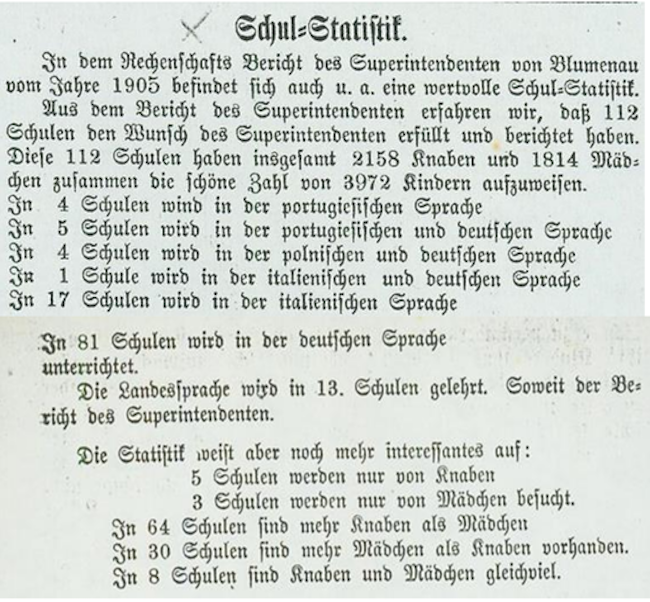 O relatório expresso na figura 3 é um exemplo de registro da situação das escolas em Blumenau. Foi elaborado em 1905 pelo superintendente do município, Alwin Schrader, que esteve à frente do governo de 1902 a 1914. No texto observam-se, entre outras informações, o número das escolas e a língua de instrução delas. A língua alemã correspondia a 81 escolas de um total de 112. Ao lado do alemão também havia escolas que ensinavam em italiano (17); português somente (4); português e alemão (5); polonês e alemão (4); italiano e alemão (1). Segundo a estatística, o português era ensinado em 13 escolas. Pelos dados constata-se que a região era composta por um cenário plurilíngue e multicultural e isso não parecia ser um problema para os imigrantes, como foi para o estado brasileiro posteriormente. Ressalta-se, contudo, que as populações indígenas não são consideradas e nem mesmo referenciadas em qualquer seção nos exemplares de 1906 a 19175. Essa invisibilidade permanece ainda hoje no contexto local.