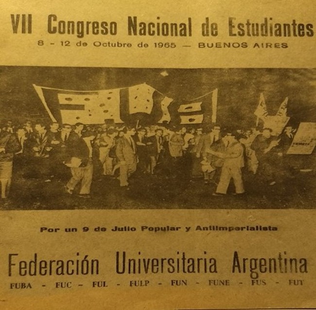 Con todo, para 1965 se generaron dos hechos de singular trascendencia para la movilización estudiantil debido a sus consecuencias y a lo que Horacio González (2020) denominaba ‘transmutación de las conciencias’. En un proceso de creciente politización universitaria y de crítica al imperialismo norteamericano que reorientaban el debate en los ejes de la soberanía y la independencia de la economia nacional. En febrero, la Facultad de Ciencias Económicas de la UBA invitó al economista estadounidense Walt Rostow a dictar una conferencia, lo cual derivó en un acalorado intercambio entre el rector Olivera y el decano Honorio Passalacqua. Sin embargo, la actividad fue suspendida luego de que el conferencista fuera recibido a tomatazos por parte de agrupaciones estudiantiles de izquierda, dado que representaba los intereses del gobierno norteamericano. La consecuencia inmediata fue la renuncia de Olivera y su reemplazo por el vicerrector Fernández Long (Zanca, 2018). En el mes de abril, Estados Unidos invadió República Dominicana y los estudiantes de todo el país, agrupados en la FUA, conjuntamente con la CGT, convergieron el 12 de mayo para repudiar el hecho y evitar el envío de soldados argentinos a Santo Domingo (Millán & Seia, 2019; Millán, 2019): “Los enfrentamientos con la policía montada y sus tanquetas fueron los más violentos de aquella época, y ese día fue asesinado el militante comunista Daniel Grinbank” (Grabois, 2014, p. 162). La Figura 2, muestra un Congreso posterior de la FUA a los sucesos mencionados:
