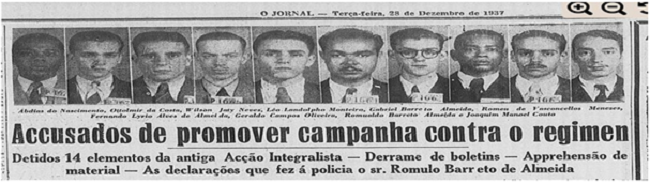 A detenção foi publicada no O Jornal, em 28 de dezembro de 1937, com a foto dos envolvidos (Figura 2). Abdias Nascimento consta na primeira posição, observando-se da esquerda para a direita.