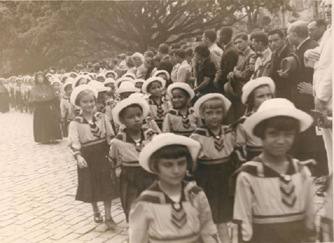 A Foto 2, localizada no Museu Imperial da cidade de Petrópolis2, é um dos raros registros de um desfile de alunas da escola Nossa Senhora do Amparo. A imagem não tem data e, de acordo com Muller (2008a), fotos sem data são um obstáculo que impede a construção de uma linha do tempo. Contudo, podemos observar pelos cortes de cabelo das alunas que a imagem é posterior ao recorte temporal foco desta pesquisa. A nitidez da foto permite a visualização de algumas alunas negras, reforçando, portanto, os argumentos de Leal (2017) e Parisi Neto (2003) de que a Escola Doméstica de Nossa Senhora do Amparo sempre recebeu meninas negras.