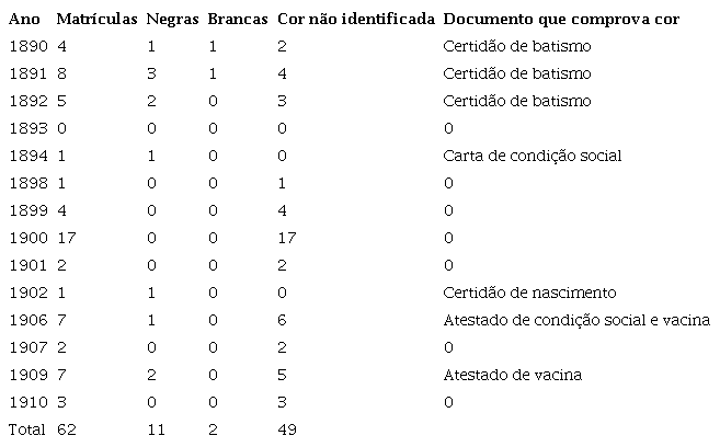 Os primeiros documentos pesquisados foram os livros de matrículas. No entanto, como estes não revelaram a cor das alunas, foi necessário o cotejamento com outros documentos fornecidos pela escola, como registros paroquiais, atestados médicos e cartas dos chamados benfeitores da instituição. Foi analisada a documentação de 62 matriculadas entre os anos de 1889 e 19101, o que resultou na localização de onze alunas pretas e pardas e duas brancas. A documentação analisada não possibilitou a identificação da cor de 49 alunas matriculadas no mesmo período.