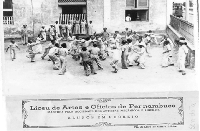 ‘Alunos em recreio’, informa a descrição impressa na moldura da fotografia (Figura 02). Segundo uma reportagem publicada no Diário de Pernambuco, em 1937, apenas as oficinas do liceu funcionavam durante o dia. As aulas primárias e secundárias do Curso Artístico e do Curso Profissional ocorriam durante a noite, no intuito de permitir que os(as) alunos(as) desenvolvessem ‘outros afazeres’ - leia-se ‘trabalhos’ - e pudessem seguir com seus estudos (Pernambuco, 1937). Vê-se que a fotografia foi intencionalmente montada, em dois planos. No primeiro plano, destaca-se a brincadeira intensa de alguns meninos rumando para o centro da foto e, no segundo plano, os olhares contemplativos nos meninos menores e a postura vigilante dos professores na janela, à direita.