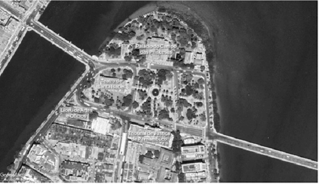 Atualmente, no Palacete do Liceu, não funcionam mais aulas. Elas foram transferidas para um antigo colégio jesuíta, o Nóbrega, em frente à Universidade Católica de Pernambuco, que passou a gerenciar o liceu. A imagem acima (Figura 06) mostra o espaço social no qual foi construída a instituição. O palacete, em 1880, encontrava-se no ‘miolo’ dos prédios da elite provincial, em frente ao Teatro Santa Isabel e ao Palácio dos Campos das Princesas - centro administrativo da província e depois do estado de Pernambuco. Ao lado do liceu, está o Tribunal de Justiça de Pernambuco, construído em 1930. O complexo arquitetônico do bairro de Santo Antônio guarda relações íntimas com o passado colonial/senhorial e ‘branco’ pernambucano. O Palácio de Friburgo, local de administração holandesa na antiga capitania, foi construído durante o governo de Maurício de Nassau e demolido ainda no século XVIII (Cavalcanti, 2009). Edificado por artífices pretos e pardos, em local ‘histórico’ e administrativo (e ‘branco’), o liceu encerrou parte da trajetória daqueles aristocratas do trabalho, cimentando sua edificação de prestígio social.