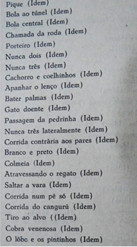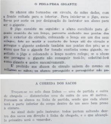 Por jogos ou recreações infantis, entende-se uma série de exercícios corporais e de ocupações livres e voluntárias dos meninos, cujo fim é fortificar o corpo, descansar dos trabalhos intelectuais e instruir de um modo divertido e agradável. Eles nos oferecem inúmeras vantagens; dão a criança uma ocupação conveniente e um alimento a sua atividade; desenvolvem admiravelmente as funções respiratórias; contribuem muito para o desenvolvimento do corpo; da inteligência; aperfeiçoam a atenção; a perspicácia e o espírito de observação e finalmente fazem nascer na criança o espírito da sociabilidade (Fundão, 1932, p. 5).