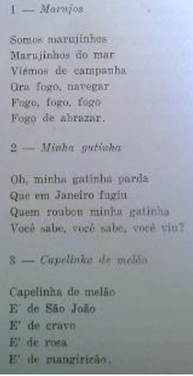 Para realizar essa dinâmica, a preferência era para as cantigas de roda que estavam diretamente relacionadas com o que era identificado como ‘literatura popular’, oriundas do “[...] nosso folklore cujas canções casam-se tão bem com esse gênero de escola [infantil]” (Machado, 1935, p. 7), para promover uma assimilação cultural. A literatura popular estava presente na execução de muitas brincadeiras e jogos populares, a exemplo de ‘Mamãe, posso ir?’, ‘O seu lobo está aí’, ‘Pega lenço’, ‘Batata quente’ e ‘Boca de forno’. Para Mário de Andrade, defensor do folclore brasileiro entre as décadas de 1920 e 1940, promover a cultura brasileira por sua literatura, contos, lendas, mitos e histórias que habitam o imaginário de povos brasileiros de diversas regiões do Brasil era uma maneira de fazer o país passar a ter uma melhor consciência sobre si mesmo14.