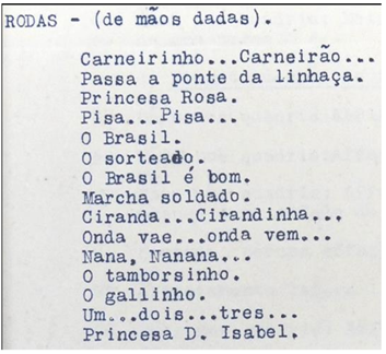 Para disponibilizar ao professorado práticas que poderiam ser trabalhadas pela Educação Física, algumas ações eram desempenhadas. No Rio de Janeiro, a Divisão de Educação Física realizou um trabalho de recolhimento de cantigas populares e de danças regionais, apresentando-se, dentre as danças indicadas, ‘Danças indígenas’, ‘Polca das crianças’, ‘Na Bahia tem’, ‘Maestro’, ‘Oh! Suzana’, ‘Sete passos’, ‘Dança espanhola e Shottisch sueco’ (Barbosa Leite, 1943).