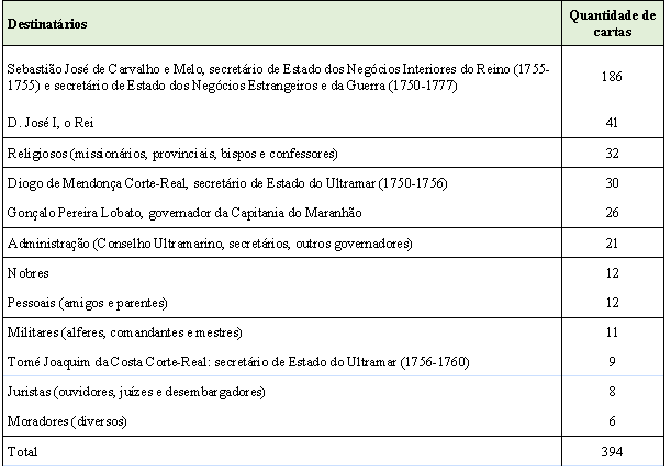 O quadro demonstra o volume de correspondência emitido por Mendonça Furtado ao seu irmão e, por extensão, a preponderância do secretário de Estado português como seu principal interlocutor. Observa-se também que o segundo interlocutor de Mendonça Furtado, isto é, o segundo maior destinatário de suas correspondências, era o próprio D. José I. Com isso, constataram-se o alinhamento e a total concordância do governador do Estado do Grão-Pará com o projeto político português.