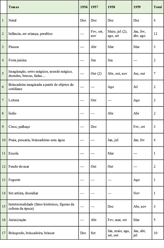 Assim, após a delimitação dos elementos visuais comuns às imagens, passou-se à delimitação de possíveis temas presentes nas capas, inferidos pelas figuras e narrativas figurativizadas. As 43 capas evidenciam diferentes temas, sendo que alguns se repetem em mais de um número, conforme apresentado no Quadro 1.