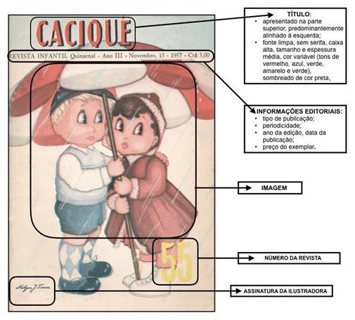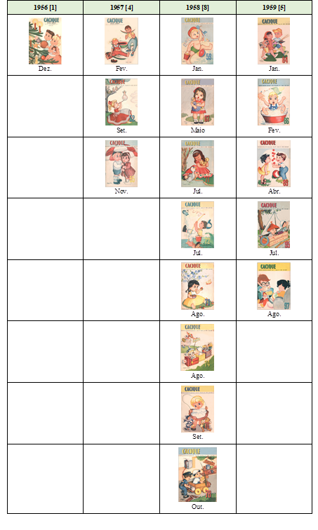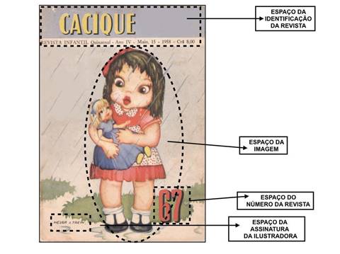 Mesmo sendo um elemento que pode assumir uma função exclusivamente de sedução ao leitor pretendido, a capa de uma publicação como a Cacique pode também revelar sentidos por meio de elementos de expressão visual que se relacionam reciprocamente a conteúdos de significação da infância, do brincar e da brincadeira que deixam marcas de um contexto histórico e social e dos valores atribuídos a esses temas.