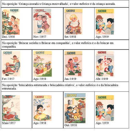 A percepção sobre essas oposições relacionadas aos temas que se tem em foco neste estudo leva aos seguintes enunciados de sentido. Primeiro, caracterizando as crianças: as crianças são, em sua maioria, asseadas, vestem roupas em perfeito estado, i. e., claras, limpas, sem manchas, não amarrotadas nem rotas. Depois, no que diz respeito ao brincar, grande parte das capas mostra crianças em companhia de outra, configurando uma dupla. Apenas a capa de agosto de 1958 apresenta um grupo com 3 crianças brincando juntas. Além disso, sobre o tipo de brincadeira ou como a brincadeira se organiza, percebe-se que apenas 5 capas trazem crianças brincando de modo mais livre e criativo, sem a presença de brinquedos estruturados ou objetos do cotidiano adulto como parte da ação mostrada na cena. No Quadro 3, alguns exemplos revelam essas oposições que possibilitam enunciar as narrativas descritas.
