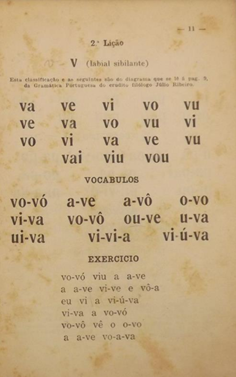 Após o prólogo, segue a apresentação metodológica da cartilha, na qual observamos que a ordem das lições empregadas pelo autor não é aleatória, iniciando pelas ‘vozes primitivas a, e, i, o, u’, consideradas ‘puras’, formando com elas ditongos orais (ai, ia, au…) e, na sequência, as vogais acentuadas (ê, ó, é, ô…). Seguem as lições começando pela ‘labial sibilant’e V, classificação adotada ao longo do livro com base no diagrama da Grammatica portugueza de Julio Ribeiro (1914). A combinação das consoantes com as vogais, que abre as lições, é apresentada de forma salteada para “[...] evitar a decoração inconsciente, que consegue idiotizar meninos inteligentes e ativos” (Galhardo, 1911). Para o autor, essa metodologia leva à ‘indecoração constante’, por isso afirma que esse modo de apresentar as dificuldades gradativamente, intercalando em todos os exercícios as sílabas aprendidas, seria para evitar esquecimento, por parte do aluno, dos elementos conhecidos nas lições anteriores. Trata-se, portanto, do que ele configura de ‘recordação contínua’, modelo que segue em todas as lições, como podemos observar logo abaixo no exemplo da segunda lição (Figura 6).