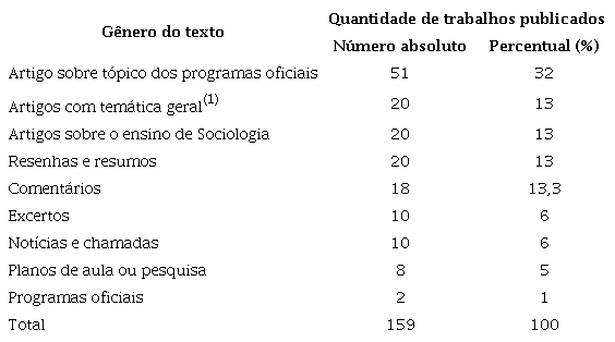 No total, foram identificados em Sociologia 159 trabalhos com declarada finalidade didática ou focados na reflexão sobre o ensino de Sociologia publicados entre 1939 e 1950. Essa somatória abarca todos os textos publicados na revista em 1939 e nos dois primeiros volumes de 1940, pois a própria edição denominava-se inteiramente comprometida em fornecer subsídios para o estudo da Sociologia; nos anos seguintes, foram selecionados somente os trabalhos que diziam respeito explicitamente ao ensino das Ciências Sociais. Os 159 trabalhos compreendiam artigos sobre os tópicos dos programas oficiais (do Colégio Universitário da USP e das escolas normais paulistas) (32%), com temáticas gerais (mas articuladas aos tópicos dos programas oficiais) (13%) ou centrados no ensino das Ciências Sociais (13%). Incluíam, também, resenhas e resumos (13%), comentários sobre obras e eventos (13,3%), excertos de textos (6%), notícias e chamadas para participação em concursos de pesquisa promovidos pela revista (6%) e planos de aula ou pesquisa (5%) (Tabela 1).