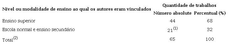 Dos 159 trabalhos, 70 são assinados4. Os demais distribuem-se entre textos sem assinatura (78 no total, incluindo artigos, chamadas, notícias, resenhas etc.) e excertos de trabalhos de autores variados. Assinam os 70 trabalhos citados 26 autores diferentes. Desses, foi identificada a filiação institucional de 20, sendo 13 ligados a universidades (respondendo por 68% dos textos com assinatura e filiação institucional identificada) e sete ao ensino secundário e a escolas normais (32% dos textos) (Tabela 2).