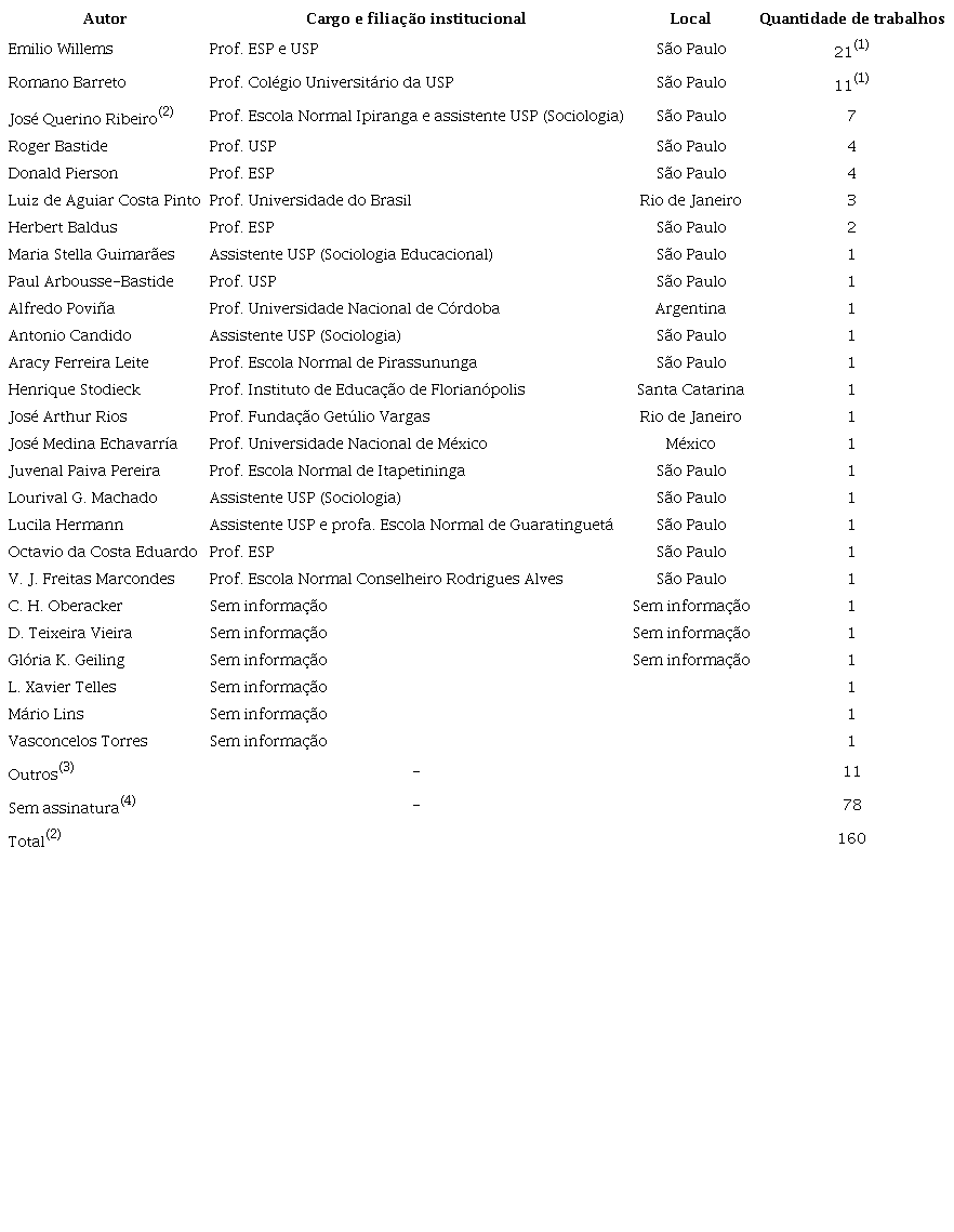 Romano Barreto e Emílio Willems responderam pela maior parte dos trabalhos publicados em Sociologia sobre a didática da disciplina: Willems assinou 21 trabalhos, Romano Barreto 11 e os dois juntos um plano de pesquisa (Tabela 3). Houve ainda 78 textos sem assinatura (entre tópicos dos programas de ensino detalhados, resenhas, artigos, notícias etc.) cuja seleção ou autoria poderia ser atribuída a eles. Depois de Barreto e Willems, os autores com maior número de publicações associadas ao ensino de Sociologia foram José Querino Ribeiro (sete), Donald Pierson (quatro), Roger Bastide (quatro), Luiz de Aguiar Costa Pinto (três) e Herbert Baldus (dois). Os demais autores responderam por um único trabalho com foco no ensino de Sociologia ou publicado nos números destinados estritamente à didática dessa disciplina.