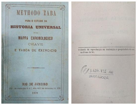 A brochura de Zaba, editada no Rio de Janeiro, tinha 39 páginas: treze dedicadas à explicação do método e outras vinte e sete com a lista de dados factuais a serem representados nos mapas. Na capa de cor azul (Figura 1) continha o título - Methodo Zaba para o estudo da história universal, com mappa chronologico, chave e taboa de exercícios -, o ano e a cidade da edição, bem como o nome e o endereço da tipografia. No entanto, embora a parte de trás da folha de rosto trouxesse a seguinte mensagem: “[...] o direito de reprodução é propriedade do autor na forma da lei [...]”, a autoria do material não era explícita porque o nome de Napoleão Félix Zaba não aparecia na capa nem na folha de rosto.