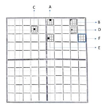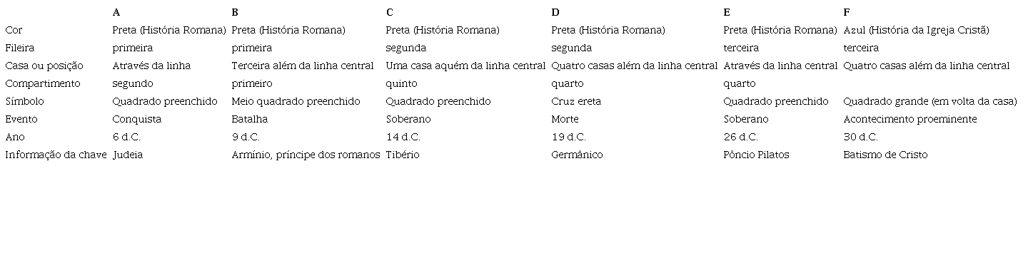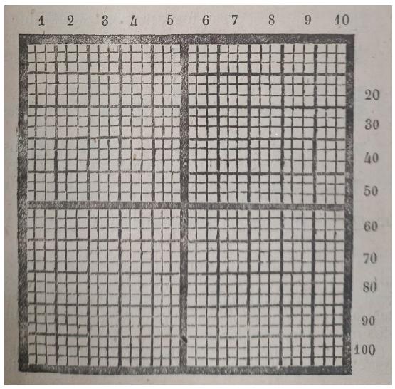 É um quadrado contendo dez fileiras, cada qual dividida em dez casas, que se contam da esquerda para a direita, conforme mostra o diagrama. Havendo dez fileiras com dez casas cada uma, teremos cem casas no nosso quadrado. Na aplicação do [método] ao estudo da história cada casa representa um ano. Em cada fileira, pois, temos dez anos, e o quadrado inteiro representa um século. Cada ano acha-se subdividido em nove compartimentos, contados igualmente da esquerda para a direita. E são estes compartimentos que, nos dão cada um, a noção distinta do caráter do acontecimento que se dera no respectivo ano.