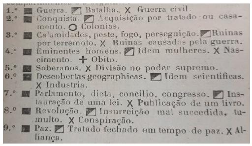 Em sua versão, Félix Zaba manteve a estrutura do diagrama de Jozef Bem, mas substituiu alguns símbolos e cores, reviu os dados factuais que compunham a chave, mudou a ordem da temática das linhas e incluiu outros tipos de acontecimentos históricos, como pestes, incêndios e outras calamidades (Figura 3). Zaba dizia que a ‘base do método’ era um diagrama (Figura 2), a partir do qual o aluno deveria decodificar os códigos que remetiam aos fatos considerados importantes da história universal. Segundo Zaba (1870, p. 6), o diagrama: