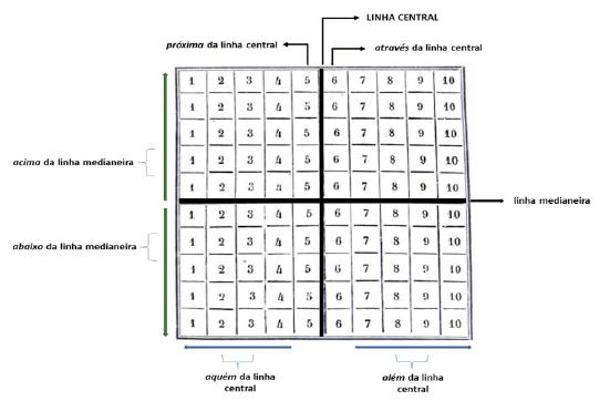 Para a leitura do diagrama (Figura 4), a recomendação era de que a contagem das caixas que representavam os anos (formando o século) deveria acontecer da esquerda para direita em relação à linha central, sendo que as caixas que estão à direita desta linha são designadas como estando ‘além’ da linha central; e aquelas que estão à esquerda dela estão ‘aquém’ da linha central. Para as linhas 5 e 6, não deveria ser dito o algarismo, apenas que estavam ‘próxima’ e ‘através’ da linha central, respectivamente. Segundo Zaba, todos esses termos (próxima, através, aquém, além da linha central) “[...] são termos técnicos na prática do sistema” (Zaba, 1870, p. 9). Para localizar o ano, a cada fileira soma-se, mentalmente, dez anos, de modo que a fileira 1 (um) diz respeito aos dez primeiros anos de um século; a segunda, entre 11 e 20 anos; a terceira, entre 21 e 30 anos; e assim sucessivamente.