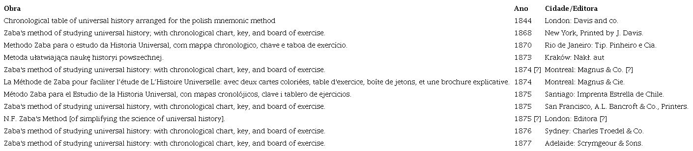 A partir do trabalho do general Bem, em 1844, Zaba lançou em Londres, pela editora Davis and Company, sua primeira versão do método polonês, com 31 páginas, sob o título Chronological table of universal history arranged for the polish mnemonic method. Com o advento das viagens pedagógicas, outras edições apareceram ao longo da década de 1870 (Quadro 1, na página seguinte) e, em todas, Zaba deu seu nome ao título. Sendo assim, a cada país visitado, uma nova edição (traduzida para a língua local e com ligeiras mudanças na chave do método) era publicada, de modo que, ao listar6 as diversas edições do Methodo Zaba, é possível, também, acompanhar o trânsito do autor nesse período.