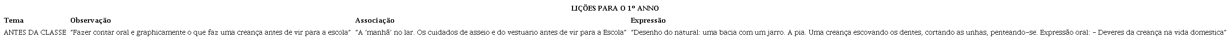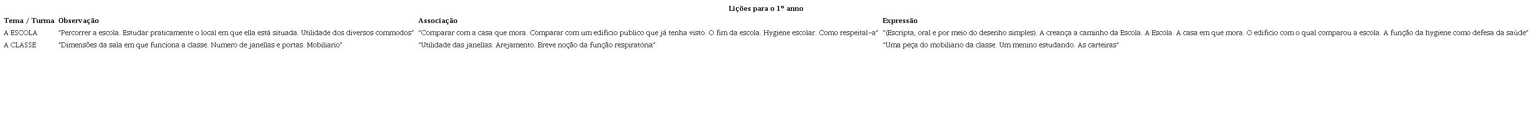 Conforme descrito na matéria denominada Idéas sobre o preparo das lições, recomendava-se que a própria escola fosse objeto de observação pelos alunos do primeiro ano, a partir de atividades como caminhar pela sala, estudar sua localização e compreender a sua distribuição e a utilidade do espaço (Quadro 1). Em seguida, viria a comparação da instalação escolar com a casa da criança e com um edifício público. Lições sobre a finalidade da escola, a higiene e o respeito às instituições de ensino completariam o bloco curricular vinculado às associações. Em síntese, por meio da observação e da comparação de espaços domésticos com a organização e com a arquitetura de prédios que abrigavam instituições públicas, pretendia-se abordar questões de higiene em diferentes espaços de convivência social e familiar, assim como o respeito à escola como representação do público.