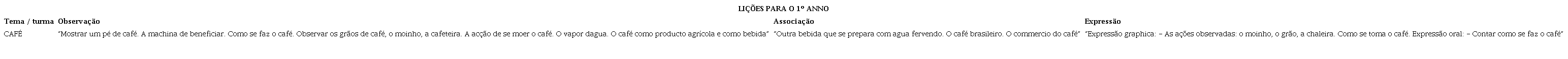 Outro ponto focalizado no primeiro ano escolar diz respeito à produção cafeeira, que sustentava a economia local ao final da década de 192014. Nesse ponto, o ciclo apresentado é o seguinte: plantio, beneficiamento, comercialização, modos de preparo e ingestão da bebida. Tudo isso para familiarizar os estudantes com o café (produto agrícola e bebida) (Quadro 3).