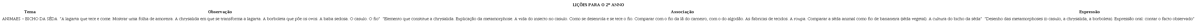 Para o segundo ano, a lição é ilustrada pelo processo de transformação da lagarta em borboleta, visando à “explicação da metamorfose” e à observação dos fenômenos da natureza, associados à produção fabril de tecidos (Quadro 4). Aos alunos pedia-se que observassem esse fenômeno natural e narrassem o que viram.