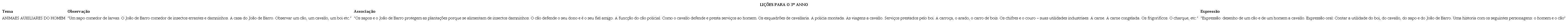 A lição selecionada para o terceiro ano trata da utilidade dos animais para a produção da vida humana, em dimensões que abrangem desde a proteção das plantações contra insetos e a fidelidade dos cães aos seus donos até viagens a cavalo, o boi, o arado, o couro, a indústria, a carne (Instrucções..., 1929, p. 11) (Quadro 5). Após observarem os animais e os processos de transformação mediados pela ação humana, os alunos narrariam esse processo na produção de uma história que relacionasse humanos e animais caninos.