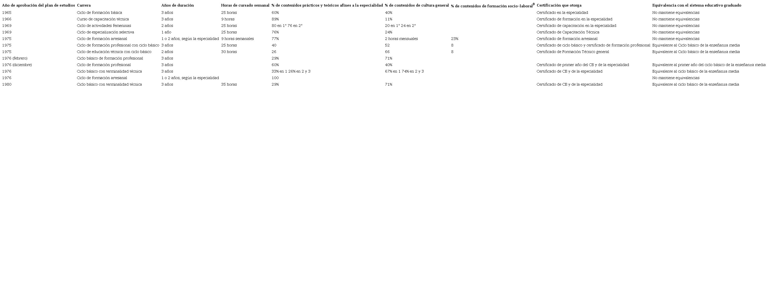 Hacia 1980 los funcionarios de la DIPESMYT7 hicieron una evaluación sobre el desarrollo del plan de ‘Ciclo Básico de Educación Técnica’ y concluyeron que la carga horaria era excesiva porque el doble turno dificultaba la concurrencia de ‘las alumnas’. Ello motivó la aprobación de una nueva propuesta curricular, que comprimía los contenidos del ciclo básico y de la formación profesional específica en un sólo turno de siete horas diarias. La formación general ocupaba el 71% de las horas (Lengua y Literatura, Ciencias Biológicas, Lengua extranjera, Educación Plástica, Geografía, Cultura musical, Formación Cívica, Ciencias Físico-Químicas, Historia, Matemática y Educación Física) y la educación práctica el 29% cada año y se desarrollaba en las especialidades pautadas para los planes de formación profesional y artesanal en 1975 (Decreto nº 370, 1980; Nuevo plan de…, 1980). También cambiaron las condiciones de ingreso del ‘plan de Formación Artesanal’, aprobado en 1976, quitándose el requisito de la edad mínima a fin de facilitar el acceso de menores. Sin embargo, la exigencia de nivel primario cumplido se mantuvo y fue restrictiva para todas las especialidades, a excepción de los cursos de Manualidades (Decreto nº 508, 1980).