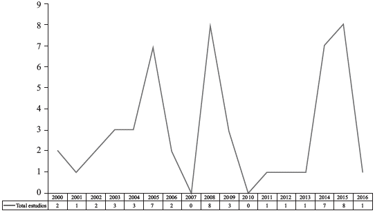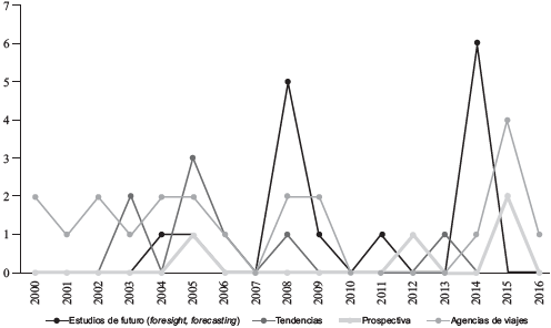 Uno de los principales criterios que se tomaron en cuenta para analizar los estudios encontrados fue su temporalidad. Como se puede observar en la figura 1, las publicaciones con respecto a la prospectiva, las tendencias, las agencias de viajes y los estudios de futuro han estado presentes desde el inicio del milenio; sin embargo, es notable una mayor producción académica en 2005 y 2008, y más recientemente en 2014 y 2015, años en los que se encontraron más investigaciones relacionadas con el tema.