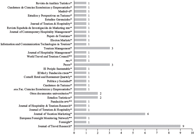 Los artículos se publicaron en 25 revistas científicas, seis estudios de consultoría y dos documentos universitarios. De estas revistas se destacan cinco journals, que contribuyen con el 46 % de los artículos: Journal of Travel Research (9), Journal of Vacation Marketing (6), Tourism Management (3), Pasos (3) y la Revista Estudios Turísticos (2) (ver figura 2).