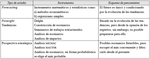 Por su parte, los estudios de prospectiva estratégica utilizan los instrumentos propios de la escuela francesa de la prospectiva (encabezada por Michel Godet), tales como los análisis MICMAC, MACTOR y la elección del escenario apuesta, así como las estrategias para llegar a él a partir del presente.