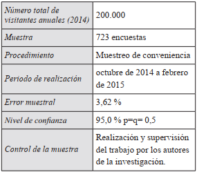 Entre octubre de 2014 y febrero de 2015 se llevaron a cabo 746 encuestas en total, de las cuales 723 fueron válidas. Los cuestionarios se pasaron en diferentes horarios y días, con la finalidad de tratar de recoger así un abanico más amplio de visitantes encuestados y tener la mayor aleatoriedad posible. Se utilizó un muestreo de conveniencia, generalmente empleado en este tipo de investigaciones, en las que los turistas cuentan con la disponibilidad para ser encuestados en un tiempo y espacio determinados (Finn, Elliott-White y Walton, 2000). No se estratificó por ninguna variable sociodemográfica, pues no se disponía de estudios previos que avalaran la realización de esta estratificación. La tasa de rechazos a la realización del cuestionario por parte de los turistas fue baja y no fue significativa en función de ninguna de las variables planteadas. La duración de la realización de la encuesta por parte del visitante no sobrepasó los 10 minutos.