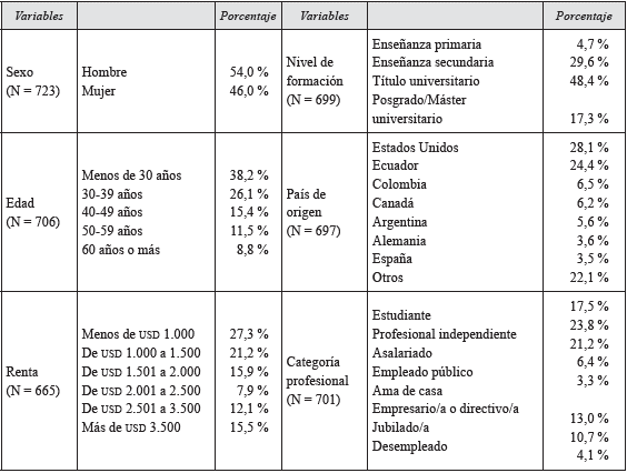 Al igual que ocurre en otros trabajos de campo, la pregunta que más reticencia suscitó en su contestación fue la relacionada con el nivel mensual de renta familiar. Así, 58 personas de las 723 personas encuestadas no contestaron, a pesar de la amplitud de los intervalos planteados en el cuestionario. De los turistas que contestaron, el 27,3 % declaró tener unos ingresos mensuales inferiores a los 1.000 dólares, mientras que el 27,7 % manifestó ganar más de 2.500 dólares mensuales. En este último caso, prácticamente la totalidad eran extranjeros. Por lo tanto, existen diferencias significativas en cuanto al nivel de renta entre los visitantes nacionales y los procedentes de países extranjeros (Moreno et al., 2016). Así, se ha detectado una asociación significativa entre el nivel de renta económica familiar mensual y la nacionalidad (coeficiente x2 de Pearson = 134,241; p = 0,000) (Moreno et al., 2016). De igual manera, se puede comprobar que más de la mitad de los visitantes ecuatorianos cuentan con una capacidad adquisitiva baja (menos de 1.000 dólares al mes). Los principales resultados se recogen en la tabla 2.