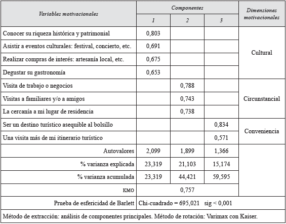 Para analizar la motivación de la visita a la ciudad de Cuenca, se seleccionaron nueve ítems, medidos en una escala de Likert de 5 puntos (1 = poco importante y 5 = muy importante). El coeficiente Alpha de Cronbach de la escala final de la base de datos alcanza un valor de 0,747, "lo que indica una consistencia interna meritoria entre los [diferentes] elementos de la escala" (Moreno et al., 2016, p. 370). En este sentido, el nivel crítico (p) que se relaciona con el estadístico F (85,102) del análisis de varianza utilizado para contrastar la hipótesis nula, y que está basado en que todos los elementos de la escala tienen la misma media (ANOVA), es menor que 0,001, por consiguiente, la hipótesis según la cual las medias de los elementos son iguales pierde validez. En la tabla 3 se presenta la matriz factorial de componentes rotados correspondientes a la motivación de la visita a la ciudad de Cuenca; en la tabla se agrupan las diferentes variables utilizadas en tres dimensiones motivacionales.