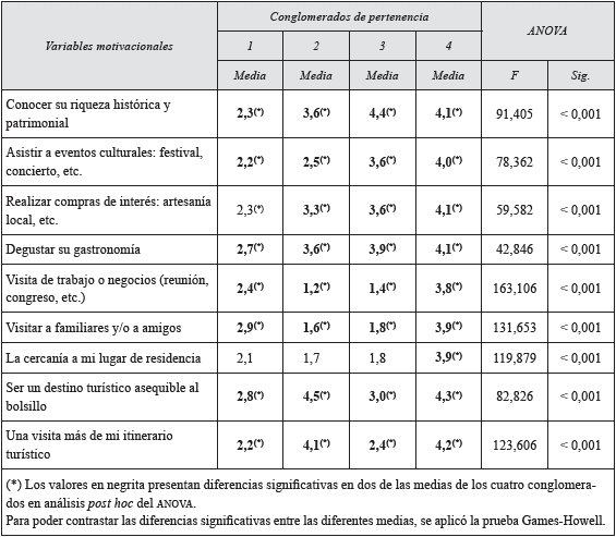 Una vez definidas las motivaciones para visitar Cuenca, se procedió a realizar una segmentación de los turistas que visitan esta ciudad, y para ello se llevó a cabo un análisis de conglomerados no jerárquico. Así, se han establecido cuatro clústeres o conglomerados basados tanto en la maximización de la varianza entre las diferentes tipologías como en la minimización de la varianza entre estas. La tabla 4 muestra dichos clústeres o conglomerados.