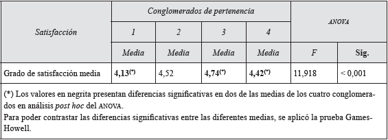 Para analizar la satisfacción de los turistas con la visita a la ciudad de Cuenca, se ha establecido nuevamente una diferencia entre los cuatro clústeres anteriormente definidos. Así, el nivel de satisfacción se midió en una escala de Likert de 5 puntos (1 = muy poco satisfecho; 5 = muy satisfecho). El coeficiente Alpha de Cronbach de la escala de la base de datos obtenida alcanza un valor de 0,779. Este valor revela una consistencia interna meritoria entre los diferentes ítems, ya que el nivel crítico (p) asociado con el estadístico F (5,416) del análisis (ANOVA) es menor que 0,02. por lo tanto, y de acuerdo con la segmentación realizada anteriormente, los resultados muestran una valoración bastante positiva de la experiencia vivida por parte de los cuatro grupos de visitantes identificados. Así, el clúster 3 es el que tiene un mayor nivel de satisfacción (4,74), seguido del clúster 2 (4,52), del 4 (4,42) y del 1 (4,13). Estos datos se reflejan en la tabla 5.