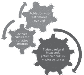 El turismo cultural es "un proceso social que crea espacios de interacción entre los visitantes, actores culturales y las comunidades receptoras" (Ministerio de Comercio, Industria y Turismo y Ministerio de Cultura, 2007, p. 4). Se construye a partir del patrimonio y sus portadores o de los actos culturales-artísticos y sus creadores, que se integran a la lógica de los productos turísticos. Los elementos constitutivos del turismo patrimonial-cultural-artístico están entrelazados y dependen de la actuación y articulación de sus actores (figura 3), que se mueven en diferentes espacios y lógicas.