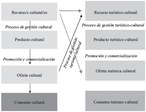 Para convertir un recurso cultural en producto turístico, se tiene que consolidar este recurso como producto cultural y luego se deben constituir actividades y servicios para su puesta en valor que permitan su visita, conocimiento, apreciación y disfrute por parte del turista. Tresserras (2006) lo describe en el siguiente esquema (figura 4), el cual expone la conversión del recurso cultural en varios pasos (recurso, producto, oferta cultural) para luego ser integrado a la oferta turística -desde un recurso turístico cultural-, pasando a producto, para luego constituir una oferta turística cultural.