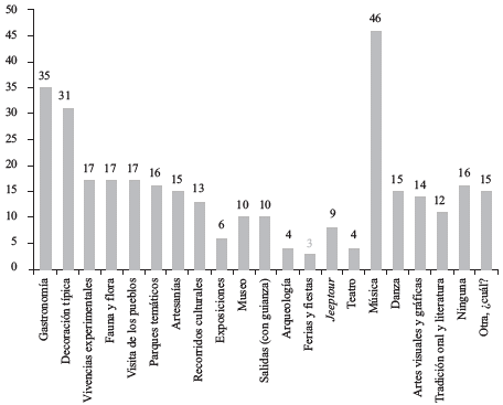 De los que incluyen una oferta cultural, artística y patrimonial, solo catorce indican las artes visuales y gráficas (14); diez, los museos (10); tres, el teatro (3); y seis, las exposiciones (6). Dieciséis (16) entrevistados consideran que no ofrecen ningún servicio cultural, artístico o cultural. Se destaca la alta demanda de la música típica (46) como elemento patrimonial, la gastronomía y la decoración típicas (31), seguida de la visita a los pueblos, las artesanías, las danzas, la tradición oral y la literatura, el jeeptour y los museos.