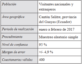 Se aplicaron 430 cuestionarios, de los cuales 400 fueron válidos, siendo este el tamaño muestral para el presente estudio, en el que se utilizó la población infinita debido a que no existe un estudio oficial que determine el número de visitantes que disfrutan la gastronomía tradicional en el cantón Salitre. El estudio contó con un margen de error de +/-4,9 %, un nivel de confianza del 95 % y una varianza del 50 %, para lo cual, una vez recogidos los datos, estos fueron organizados, tabulados y analizados usando el programa SPSS versión 22 (tabla 1).