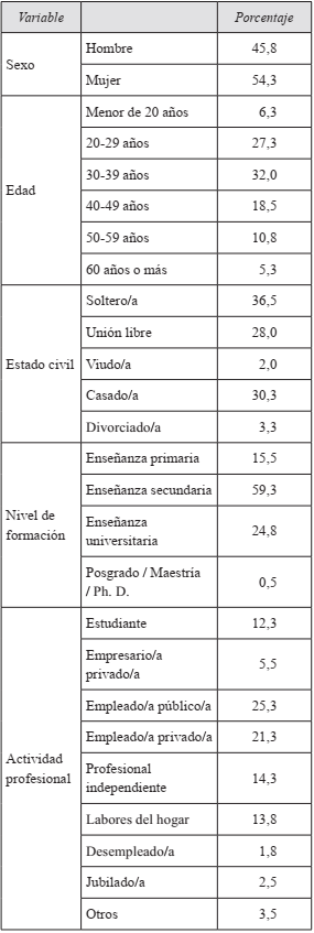 Los resultados de las variables socioeconómicas, como son el sexo, la edad, el estado civil, el nivel de formación y la actividad profesional, se encuentran en la tabla 2.