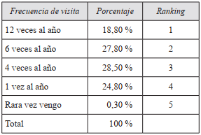 La frecuencia de visita se muestra en la tabla 3. De acuerdo con los resultados, el 28,5 % de los turistas visitan Salitre 4 veces al año, seguido del 27,8 %, que lo visitan 6 veces al año, por lo que Salitre es un destino bien frecuentado por el mercado turístico objetivo.