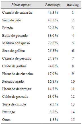 En cuanto a las preferencias por los platos típicos de Salitre, estas se muestran en la tabla 5. Estos hallazgos evidencian que los visitantes, al momento de degustar un plato tradicional, prefieren la cazuela de camarón (49,3 %), el seco de pato (43,5 %) y la fritada (39,8 %); estos resultados son diferentes a los obtenidos por Orden et al. (2017), quienes establecen otros platos preferidos de la gastronomía típica de Guayaquil (Ecuador), lo que podría indicar que en Salitre se puede encontrar una variedad de platos típicos diferentes en relación con otros destinos de Ecuador. Estos hallazgos demuestran la rica y variada gastronomía ecuatoriana como un atractivo intangible que debería ser potencializado en la promoción turística de Ecuador. La pregunta era de respuesta múltiple, por lo tanto, la sumatoria del resultado es superior al 100 %.