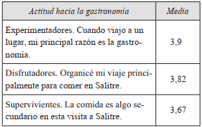 Como se presenta en la tabla 5, la actitud hacia la gastronomía es mayor en los turistas que viajan a los diferentes lugares y cuya principal razón es disfrutar la gastronomía, quienes alcanzaron una actitud media de 3,90. En cambio, los turistas que cuando viajan a Salitre van a comer alcanzaron una actitud media de 3,82. se evidencia la diferente actitud de los turistas hacia el viaje en relación con la gastronomía (Bjork y Kauppinen-Raisanen, 2016). Estos resultados como hallazgo muestran la existencia de un turismo gastronómico en el destino Salitre.