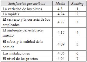 En un estudio, sierra et al. (2006) incluyeron cuatro variables para analizar la satisfacción del servicio: a) confort de las instalaciones; b) rapidez en el servicio; c) calidad de los productos; y d) atención recibida. El presente estudio utiliza las mismas variables empleadas por Carvache et al. (2017a), quienes analizan la satisfacción por atributos en General Villamil Playas, en Ecuador, utilizando siete variables: a) el sabor y la calidad de la comida, b) la variedad de los platos, c) el servicio y la cortesía de los empleados, d) la rapidez con la que lo atendieron, e) el ambiente del establecimiento, f) las instalaciones y g) los precios, lo que parecería evidenciar que es un modelo apropiado que analiza el nivel de satisfacción en cuanto a la gastronomía de un destino.