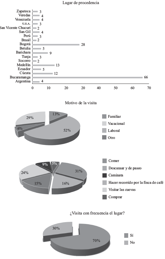 Los turistas que visitan estos municipios en su mayoría provienen del espacio regional, con un porcentaje de 58 %, siendo en su mayoría de Bucaramanga. El turismo nacional ocupa el segundo lugar, con el 31 %; al respecto, Bogotá se registra como el origen más destacado por las personas que visitaron estas poblaciones. Y con un 11 % están los visitantes extranjeros. Estos resultados indican que el santandereano es un buen consumidor del turismo regional, pues se aprecia una preocupación por conocer y disfrutar los atractivos que su tierra le brinda.