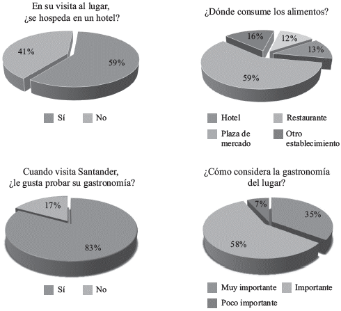 La mayoría de los entrevistados (85 %) respondió afirmativamente a la pregunta "¿conoce los platillos típicos de Santander? El porcentaje de los que contestaron con un sí indica que hay un gran conocimiento de la cocina santandereana, lo que lleva a suponer que el viaje estuvo muy relacionado con la degustación de esos productos. Esto se confirmó al complementar este punto con la siguiente pregunta: "Cuando visita Santander, ¿le gusta probar su gastronomía?", que obtuvo un sí por respuesta de parte del 83 % de los encuestados. Esta respuesta permite deducir la importancia que la gastronomía de Santander representa para las personas que visitaron estos lugares. Y para mayor certeza, la reacción fue confirmada con la siguiente pregunta: "¿Cómo considera la gastronomía del lugar?", en cuyo caso el 58 % señaló que es muy importante y el 35 % dijo que la considera importante. Con estas respuestas queda confirmado el gran valor que la gastronomía santandereana tiene no solo para la población local, sino también para la nacional e incluso para la extranjera.